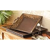 (More customer reviews)The tray is NOT cast iron as desribed. Only the handles are cast iron. The sides are stamped tin. The tray has a cardboard bottom covered in faux leather. No metal bottom. The gold antique finish is only applied to the face of the tray. The outward facing sides of the tray are matte black. The descritpion says the trays can be used to serve. Clearly printed on the bottom of the tray it says do not use for serving. it is for ornamental use only. They are fairly attractive if used for display and are only looking at the top of the tray. The black sides are really ugly and dissapointing.
